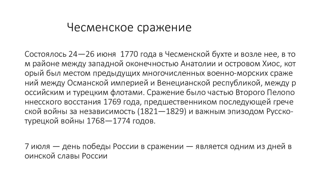 Состоялось 24—26 июня 1770 года в Чесменской бухте и возле нее, в том районе между западной оконечностью Анатолии и островом Хиос, который был местом предыдущих многочисленных военно-морских сражений между Османской империей и Венецианской республикой, между российским и турецким флотами. Сражение было частью Второго Пелопоннесского восстания 1769 года, предшественником последующей греческой войны за независимость (1821—1829) и важным эпизодом Русско-турецкой войны 1768—1774 годов. 7 июля — день победы России в сражении — является одним из дней воинской славы России