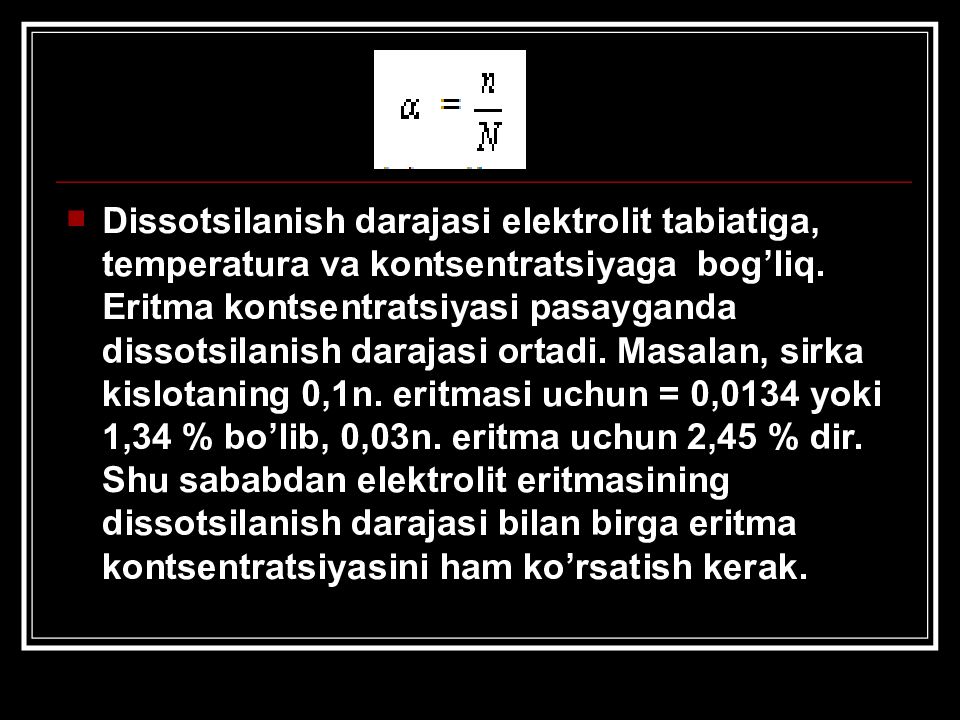 Dissotsilanish darajasi elektrolit tabiatiga, temperatura va kontsentratsiyaga bog’liq. Eritma kontsentratsiyasi pasayganda dissotsilanish darajasi ortadi. Masalan, sirka kislotaning 0,1n. eritmasi uchun = 0,0134 yoki 1,34 % bo’lib, 0,03n. eritma uchun 2,45 % dir. Shu sababdan elektrolit eritmasining dissotsilanish darajasi bilan birga eritma kontsentratsiyasini ham ko’rsatish kerak.