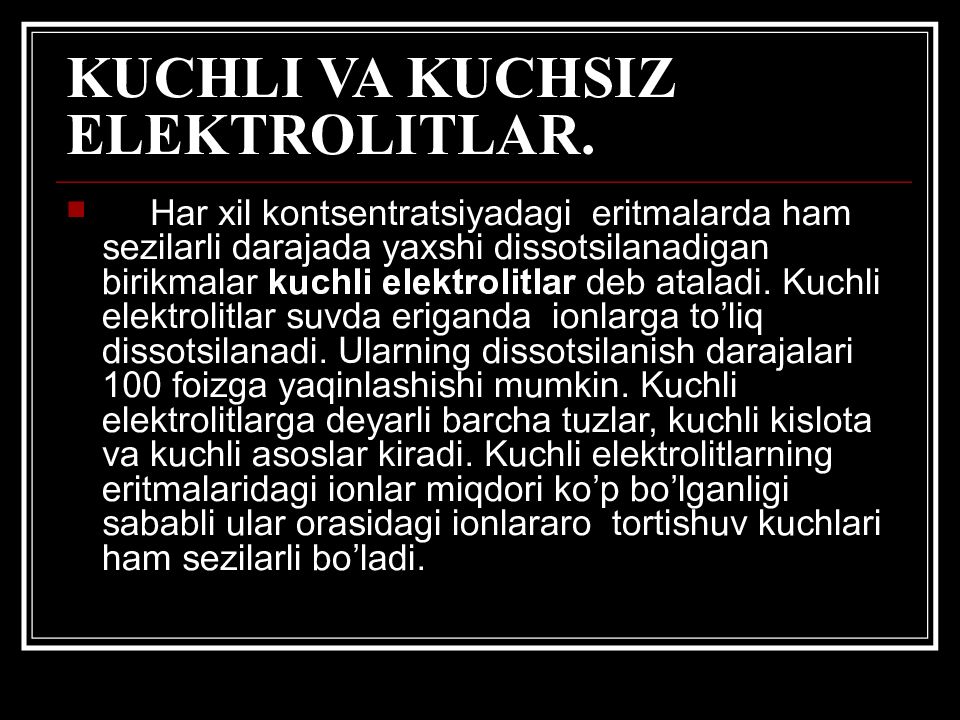 Слайд 10: KUCHLI VA KUCHSIZ ELEKTROLITLAR
