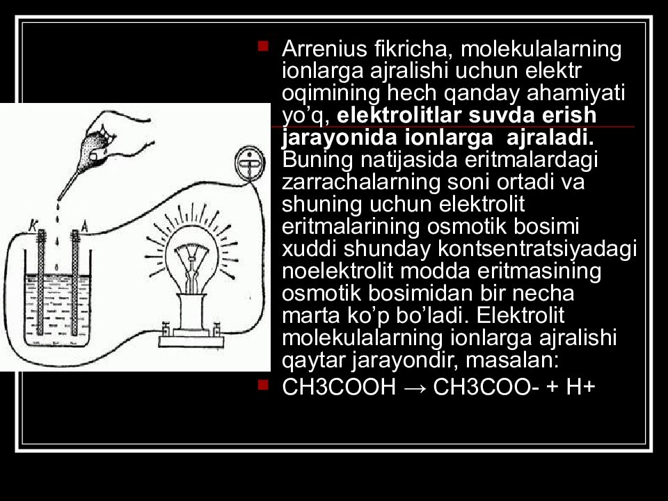 Arrenius fikricha, molekulalarning ionlarga ajralishi uchun elektr oqimining hech qanday ahamiyati yo’q, elektrolitlar suvda erish jarayonida ionlarga ajraladi. Buning natijasida eritmalardagi zarrachalarning soni ortadi va shuning uchun elektrolit eritmalarining osmotik bosimi xuddi shunday kontsentratsiyadagi noelektrolit modda eritmasining osmotik bosimidan bir necha marta ko’p bo’ladi. Elektrolit molekulalarning ionlarga ajralishi qaytar jarayondir, masalan: СН 3 СООН → СН 3 СОО - + Н +