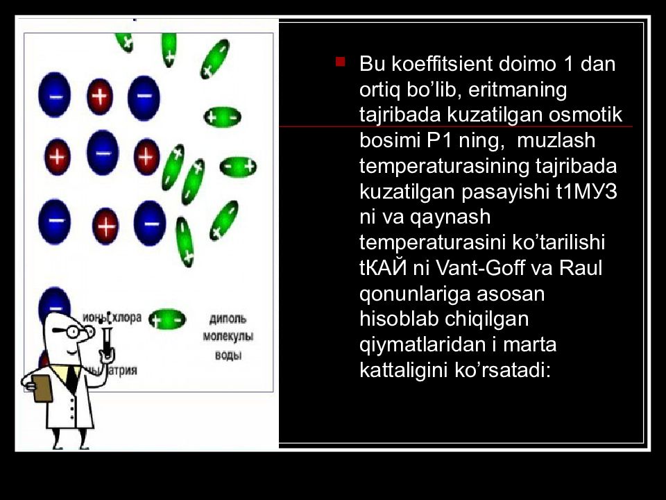 Bu koeffitsient doimo 1 dan ortiq bo’lib, eritmaning tajribada kuzatilgan osmotik bosimi Р 1 ning, muzlash temperaturasining tajribada kuzatilgan pasayishi t1 МУЗ ni va qaynash temperaturasini ko’tarilishi t КАЙ ni Vant-Goff va Raul qonunlariga asosan hisoblab chiqilgan qiymatlaridan i marta kattaligini ko’rsatadi: