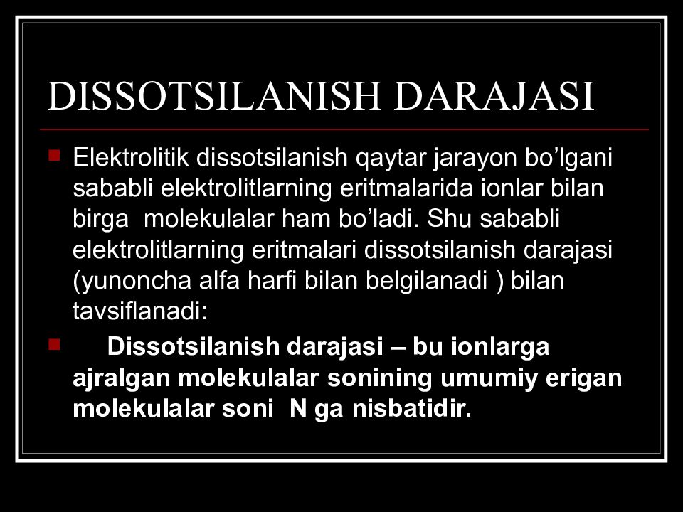 Elektrolitik dissotsilanish qaytar jarayon bo’lgani sababli elektrolitlarning eritmalarida ionlar bilan birga molekulalar ham bo’ladi. Shu sababli elektrolitlarning eritmalari dissotsilanish darajasi (yunoncha alfa harfi bilan belgilanadi ) bilan tavsiflanadi: Dissotsilanish darajasi – bu ionlarga ajralgan molekulalar sonining umumiy erigan molekulalar soni N ga nisbatidir.