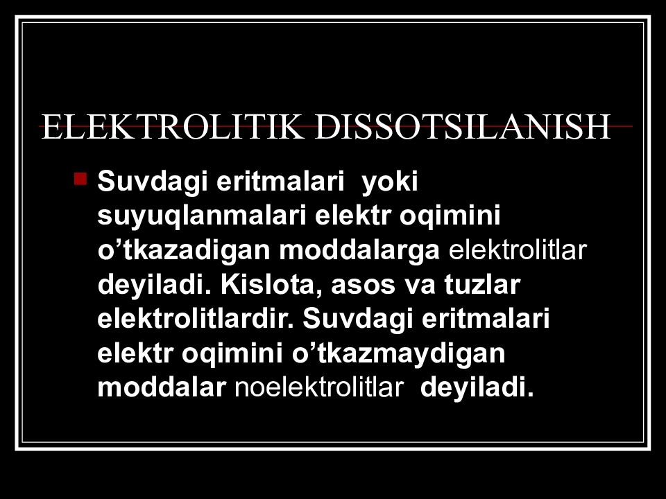 Слайд 2: ELEKTROLITIK DISSOTSILANISH