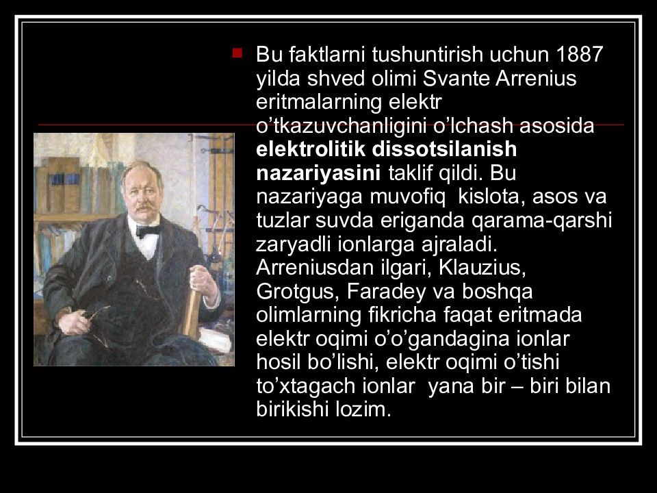 Bu faktlarni tushuntirish uchun 1887 yilda shved olimi Svante Arrenius eritmalarning elektr o’tkazuvchanligini o’lchash asosida elektrolitik dissotsilanish nazariyasini taklif qildi. Bu nazariyaga muvofiq kislota, asos va tuzlar suvda eriganda qarama-qarshi zaryadli ionlarga ajraladi. Arreniusdan ilgari, Klauzius, Grotgus, Faradey va boshqa olimlarning fikricha faqat eritmada elektr oqimi o’o’gandagina ionlar hosil bo’lishi, elektr oqimi o’tishi to’xtagach ionlar yana bir – biri bilan birikishi lozim.