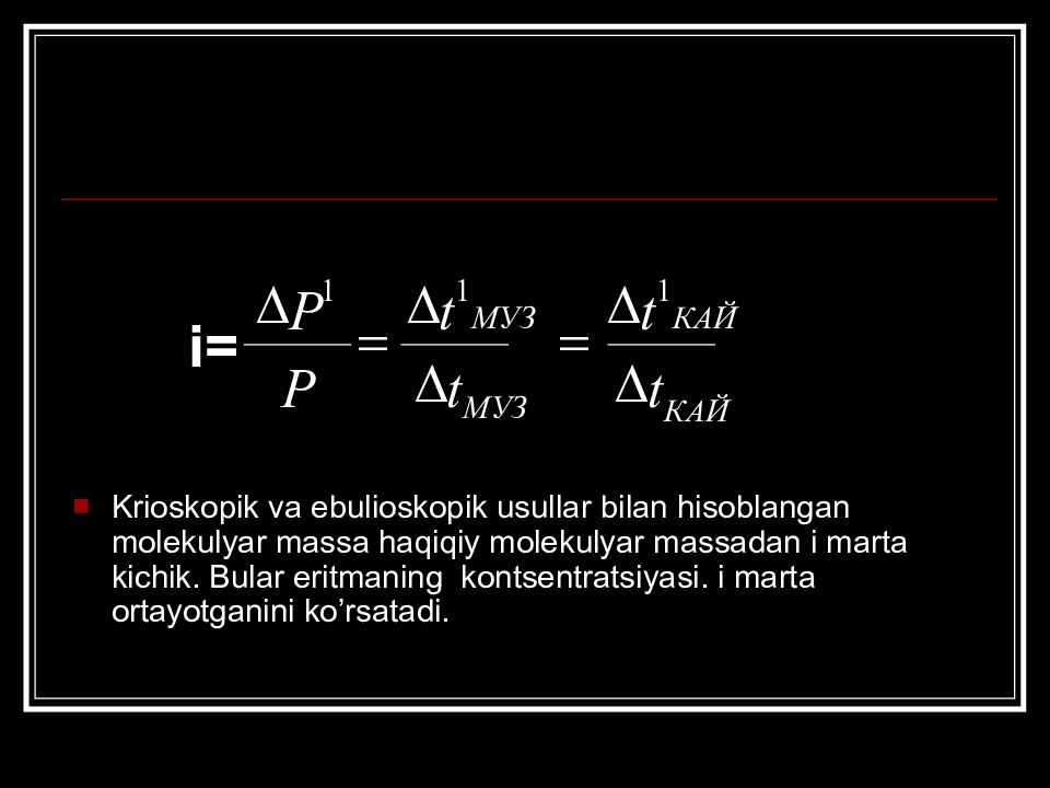 i= КАЙ КАЙ МУЗ МУЗ t t t t P P D D = D D = D 1 1 1 Krioskopik va ebulioskopik usullar bilan hisoblangan molekulyar massa haqiqiy molekulyar massadan i marta kichik. Bular eritmaning kontsentratsiyasi. i marta ortayotganini ko’rsatadi.