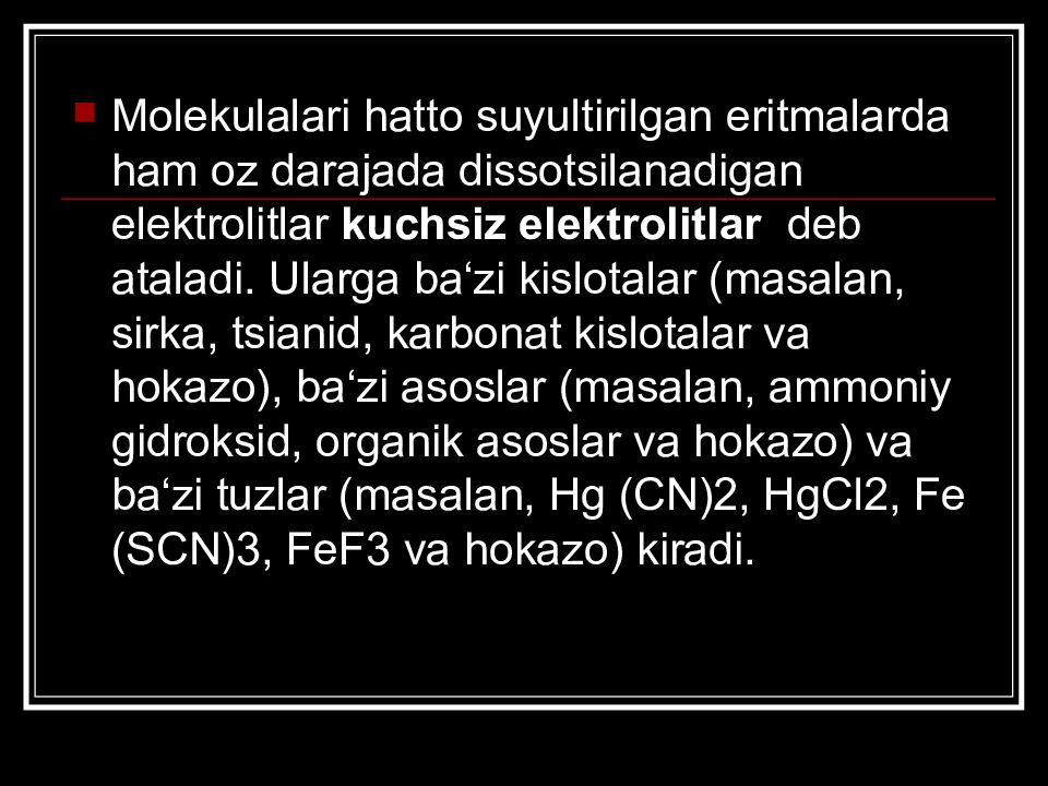 Molekulalari hatto suyultirilgan eritmalarda ham oz darajada dissotsilanadigan elektrolitlar kuchsiz elektrolitlar deb ataladi. Ularga ba‘zi kislotalar (masalan, sirka, tsianid, karbonat kislotalar va hokazo), ba‘zi asoslar (masalan, ammoniy gidroksid, organik asoslar va hokazo) va ba‘zi tuzlar (masalan, Hg (CN)2, HgCl2, Fe (SCN)3, FeF3 va hokazo) kiradi.