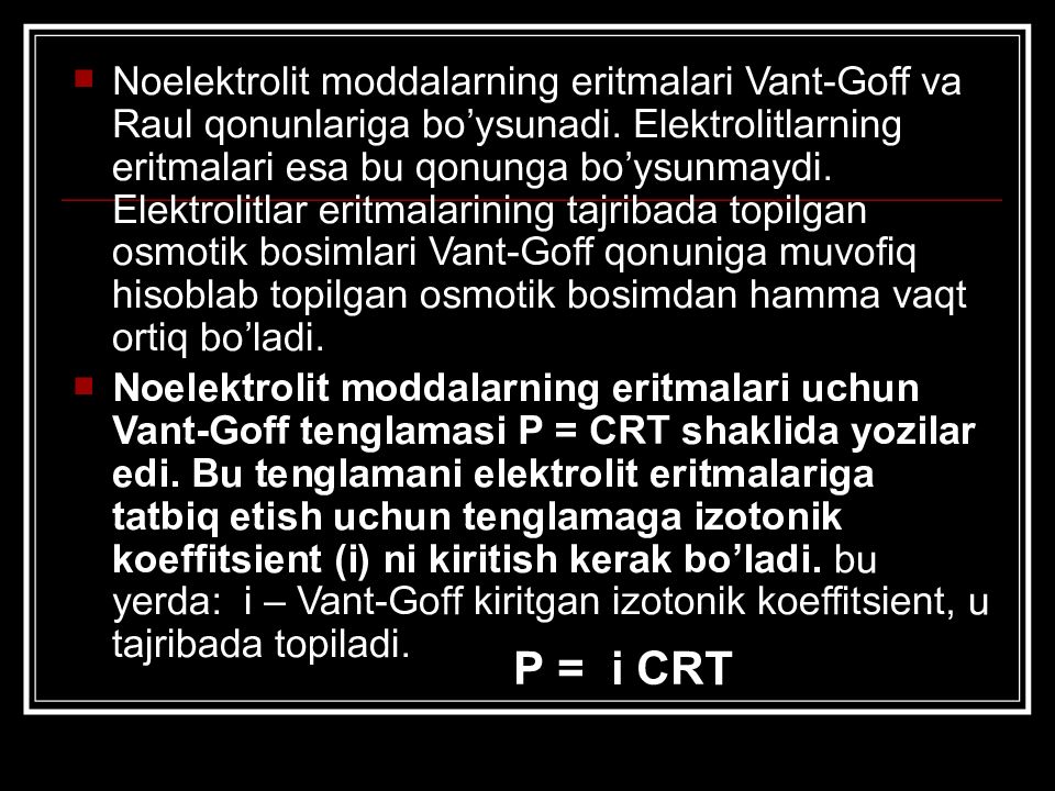 Noelektrolit moddalarning eritmalari Vant-Goff va Raul qonunlariga bo’ysunadi. Elektrolitlarning eritmalari esa bu qonunga bo’ysunmaydi. Elektrolitlar eritmalarining tajribada topilgan osmotik bosimlari Vant-Goff qonuniga muvofiq hisoblab topilgan osmotik bosimdan hamma vaqt ortiq bo’ladi. Noelektrolit moddalarning eritmalari uchun Vant-Goff tenglamasi Р = С RT shaklida yozilar edi. Bu tenglamani elektrolit eritmalariga tatbiq etish uchun tenglamaga izotonik koeffitsient (i) ni kiritish kerak bo’ladi. bu yerda: i – Vant-Goff kiritgan izotonik koeffitsient, u tajribada topiladi. Р = i CRT