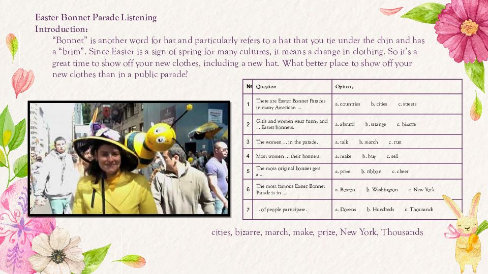 Easter Bonnet Parade Listening Introduction: “Bonnet” is another word for hat and particularly refers to a hat that you tie under the chin and has a “brim”. Since Easter is a sign of spring for many cultures, it means a change in clothing. So it’s a great time to show off your new clothes, including a new hat. What better place to show off your new clothes than in a public parade? № Question Options 1 There are Easter Bonnet Parades in many American... a. countries b. cities c. streets 2 Girls and women wear funny and... Easter bonnets. a. absurd b. strange c. bizarre 3 The women... in the parade. a. talk b. march c. run 4 Most women... their bonnets. a. make b. buy c. sell 5 The most original bonnet gets a... a. prize b. ribbon c. cheer 6 The most famous Easter Bonnet Parade is in... a. Boston b. Washington c. New York 7 ... of people participate. a. Dozens b. Hundreds c. Thousands cities, bizarre, march, make, prize, New York, Thousands