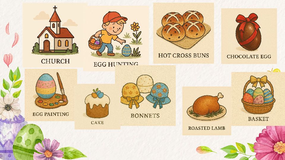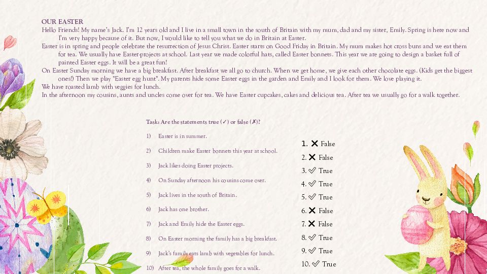 Task: Are the statements true (✓) or false (✗)? Easter is in summer. Children make Easter bonnets this year at school. Jack likes doing Easter projects. On Sunday afternoon his cousins come over. Jack lives in the south of Britain. Jack has one brother. Jack and Emily hide the Easter eggs. On Easter morning the family has a big breakfast. Jack’s family eats lamb with vegetables for lunch. After tea, the whole family goes for a walk. OUR EASTER Hello Friends! My name’s Jack. I’m 12 years old and I live in a small town in the south of Britain with my mum, dad and my sister, Emily. Spring is here now and I’m very happy because of it. But now, I would like to tell you what we do in Britain at Easter. Easter is in spring and people celebrate the resurrection of Jesus Christ. Easter starts on Good Friday in Britain. My mum makes hot cross buns and we eat them for tea. We usually have Easter-projects at school. Last year we made colorful hats, called Easter bonnets. This year we are going to design a basket full of painted Easter eggs. It will be a great fun! On Easter Sunday morning we have a big breakfast. After breakfast we all go to church. When we get home, we give each other chocolate eggs. (Kids get the biggest ones!) Then we play "Easter egg hunt". My parents hide some Easter eggs in the garden and Emily and I look for them. We love playing it. We have roasted lamb with veggies for lunch. In the afternoon my cousins, aunts and uncles come over for tea. We have Easter cupcakes, cakes and delicious tea. After tea we usually go for a walk together. 1. ❌ False 2. ❌ False 3. ✅ True 4. ✅ True 5. ✅ True 6. ❌ False 7. ❌ False 8. ✅ True 9. ✅ True 10. ✅ True