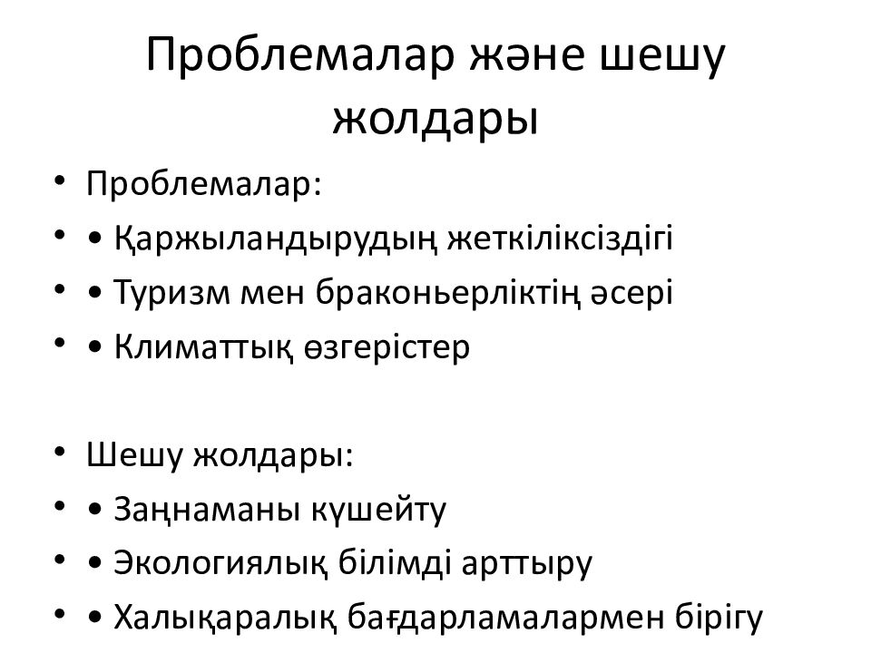 Проблемалар: • Қаржыландырудың жеткіліксіздігі • Туризм мен браконьерліктің әсері • Климаттық өзгерістер Шешу жолдары: • Заңнаманы күшейту • Экологиялық білімді арттыру • Халықаралық бағдарламалармен бірігу • Жасыл туризмді дамыту