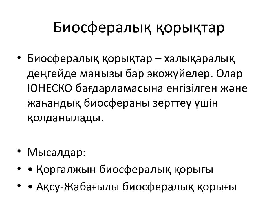 Биосфералық қорықтар – халықаралық деңгейде маңызы бар экожүйелер. Олар ЮНЕСКО бағдарламасына енгізілген және жаһандық биосфераны зерттеу үшін қолданылады. Мысалдар: • Қорғалжын биосфералық қорығы • Ақсу-Жабағылы биосфералық қорығы