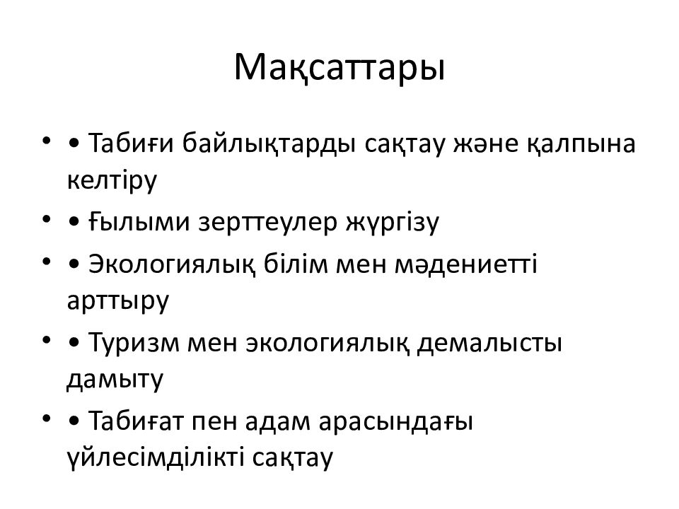 • Табиғи байлықтарды сақтау және қалпына келтіру • Ғылыми зерттеулер жүргізу • Экологиялық білім мен мәдениетті арттыру • Туризм мен экологиялық демалысты дамыту • Табиғат пен адам арасындағы үйлесімділікті сақтау