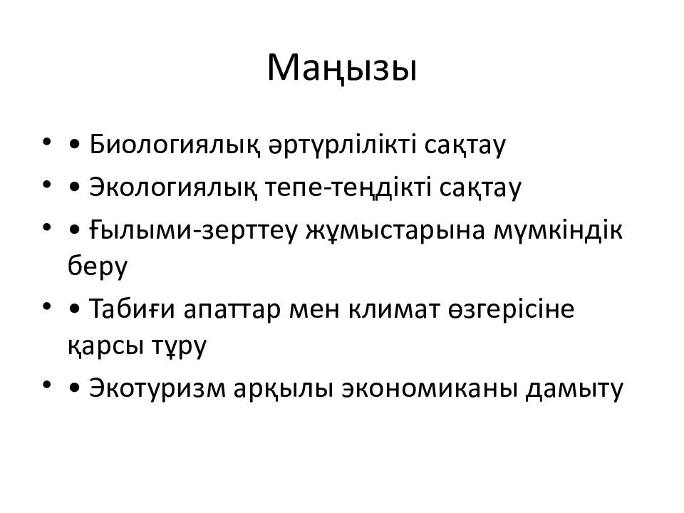 • Биологиялық әртүрлілікті сақтау • Экологиялық тепе-теңдікті сақтау • Ғылыми-зерттеу жұмыстарына мүмкіндік беру • Табиғи апаттар мен климат өзгерісіне қарсы тұру • Экотуризм арқылы экономиканы дамыту