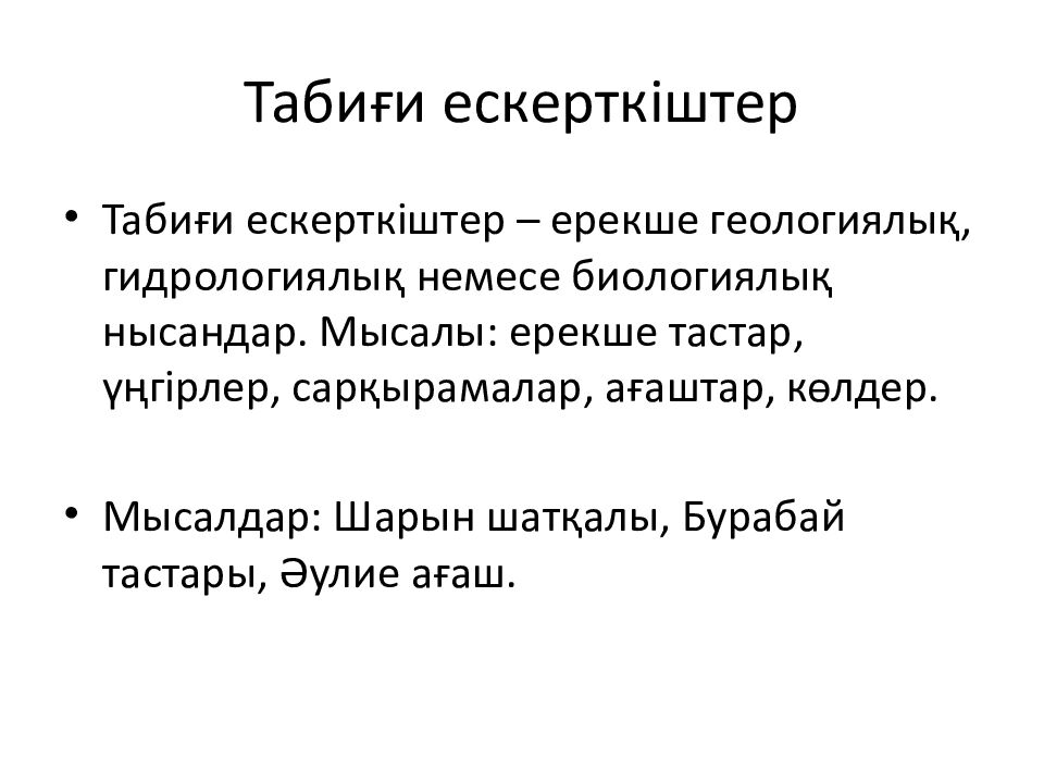 Табиғи ескерткіштер – ерекше геологиялық, гидрологиялық немесе биологиялық нысандар. Мысалы: ерекше тастар, үңгірлер, сарқырамалар, ағаштар, көлдер. Мысалдар: Шарын шатқалы, Бурабай тастары, Әулие ағаш.