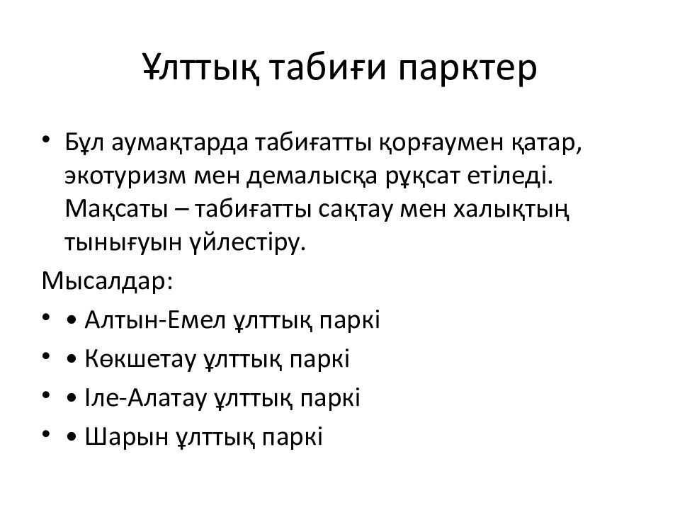 Бұл аумақтарда табиғатты қорғаумен қатар, экотуризм мен демалысқа рұқсат етіледі. Мақсаты – табиғатты сақтау мен халықтың тынығуын үйлестіру. Мысалдар: • Алтын-Емел ұлттық паркі • Көкшетау ұлттық паркі • Іле-Алатау ұлттық паркі • Шарын ұлттық паркі
