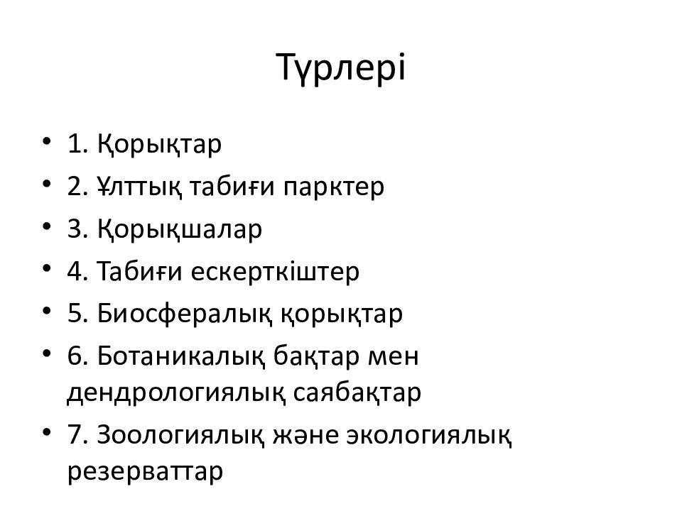 1. Қорықтар 2. Ұлттық табиғи парктер 3. Қорықшалар 4. Табиғи ескерткіштер 5. Биосфералық қорықтар 6. Ботаникалық бақтар мен дендрологиялық саябақтар 7. Зоологиялық және экологиялық резерваттар