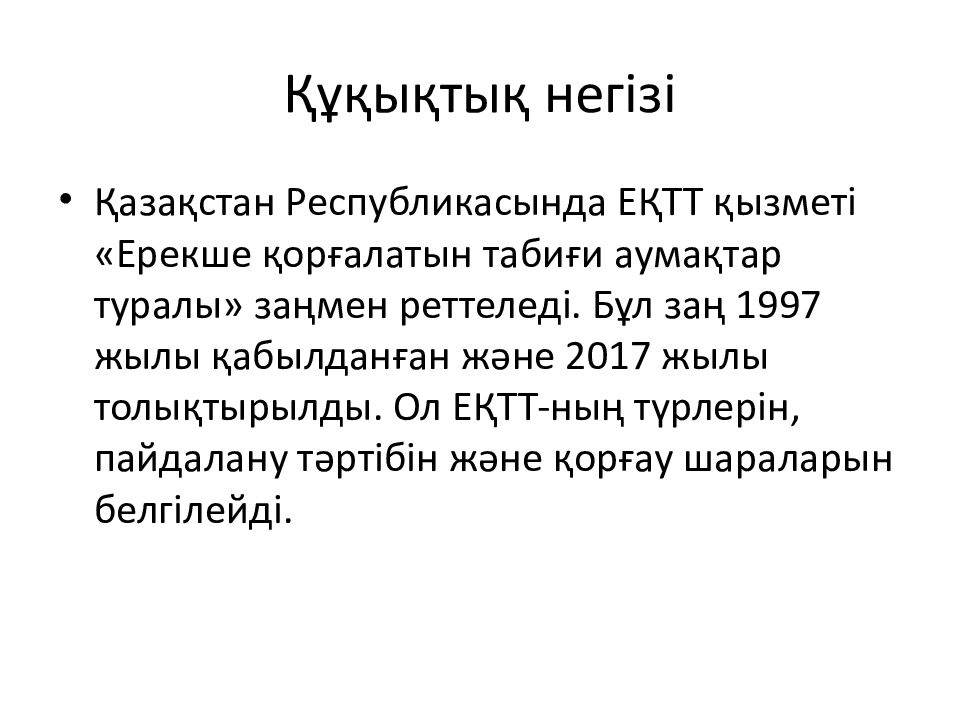 Қазақстан Республикасында ЕҚТТ қызметі «Ерекше қорғалатын табиғи аумақтар туралы» заңмен реттеледі. Бұл заң 1997 жылы қабылданған және 2017 жылы толықтырылды. Ол ЕҚТТ-ның түрлерін, пайдалану тәртібін және қорғау шараларын белгілейді.