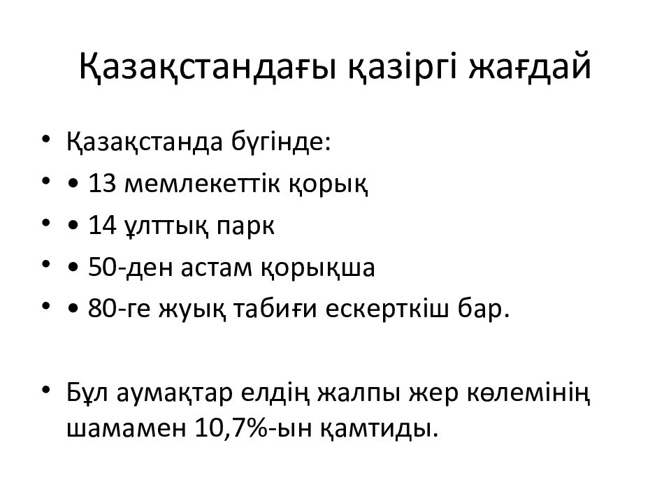 Қазақстанда бүгінде: • 13 мемлекеттік қорық • 14 ұлттық парк • 50-ден астам қорықша • 80-ге жуық табиғи ескерткіш бар. Бұл аумақтар елдің жалпы жер көлемінің шамамен 10,7%-ын қамтиды.