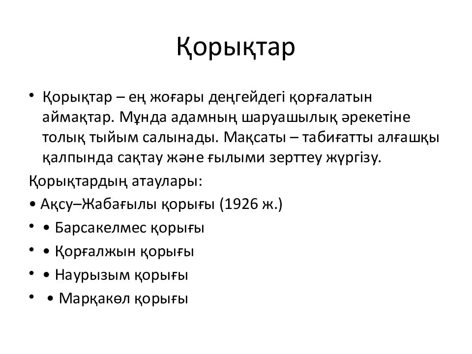 Қорықтар – ең жоғары деңгейдегі қорғалатын аймақтар. Мұнда адамның шаруашылық әрекетіне толық тыйым салынады. Мақсаты – табиғатты алғашқы қалпында сақтау және ғылыми зерттеу жүргізу. Қорықтардың атаулары: • Ақсу–Жабағылы қорығы (1926 ж.) • Барсакелмес қорығы • Қорғалжын қорығы • Наурызым қорығы • Марқакөл қорығы