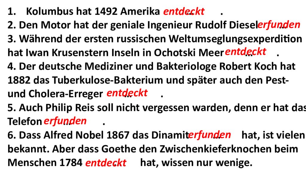 Kolumbus hat 1492 Amerika …. 2. Den Motor hat der geniale Ingenieur Rudolf Diesel …. 3. Während der ersten russischen Weltumseglungsexperdition hat Iwan Krusenstern Inseln in Ochotski Meer …. 4. Der deutsche Mediziner und Bakteriologe Robert Koch hat 1882 das Tuberkulose-Bakterium und später auch den Pest- und Cholera- Erreger …. 5. Auch Philip Reis soll nicht vergessen warden, denn er hat das Telefon …. 6. Dass Alfred Nobel 1867 das Dinamit … hat, ist vielen bekannt. Aber dass Goethe den Zwischenkieferknochen beim Menschen 1784 … hat, wissen nur wenige. entdeckt erfunden entdeckt entdeckt erfunden erfunden entdeckt