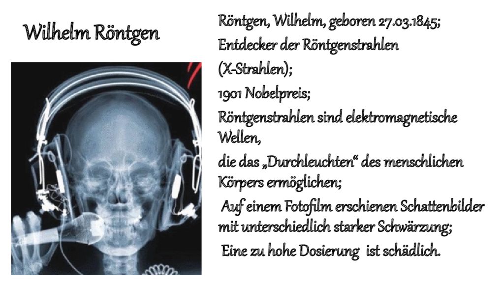Röntgen, Wilhelm, geboren 27.03.1845; Entdecker der Röntgenstrahlen ( X-Strahlen ); 1901 Nobelpreis ; Röntgenstrahlen sind elektromagnetische Wellen, die das „ Durchleuchten “ des menschlichen Körpers ermöglichen ; Auf einem Fotofilm erschienen Schattenbilder mit unterschiedlich starker Schwärzung ; Eine zu hohe Dosierung ist schädlich.