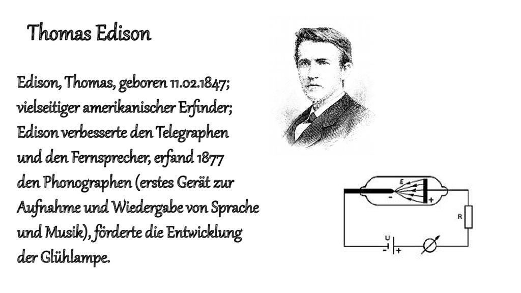 Edison, Thomas, geboren 11.02.1847; vielseitiger amerikanischer Erfinder ; Edison verbesserte den Telegraphen und den Fernsprecher, erfand 1877 den Phonographen ( erstes Gerät zur Aufnahme und Wiedergabe von Sprache und Musik ), förderte die Entwicklung der Glühlampe.