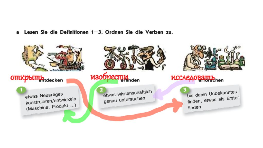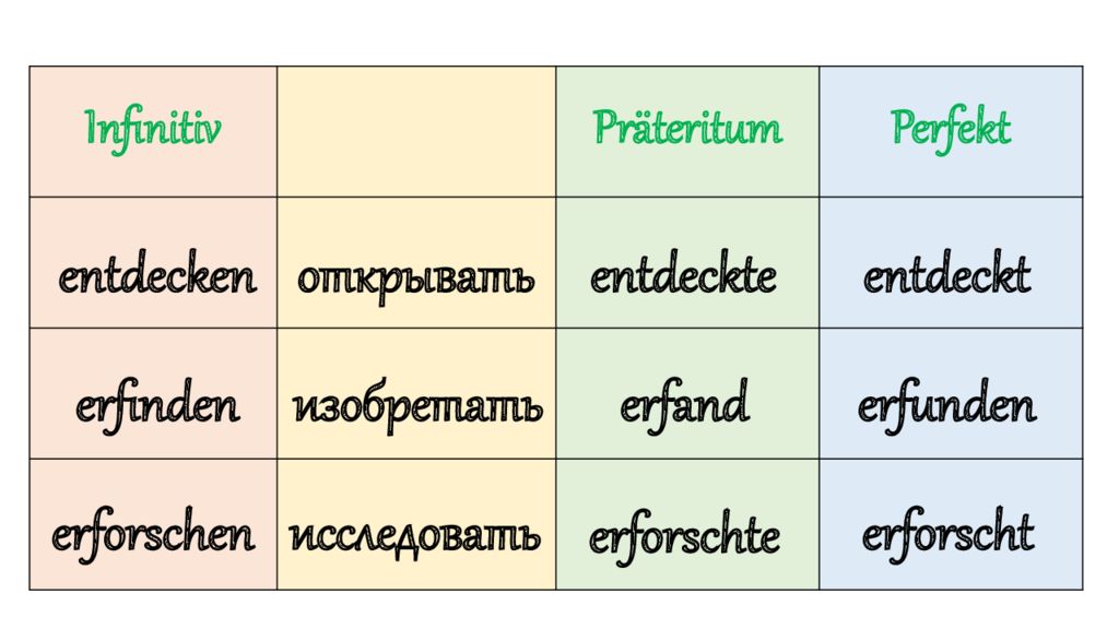 Infinitiv Präteritum Perfekt entdecken erfinden erforschen открывать изобретать исследовать entdeckte erfand erforschte entdeckt erfunden erforscht