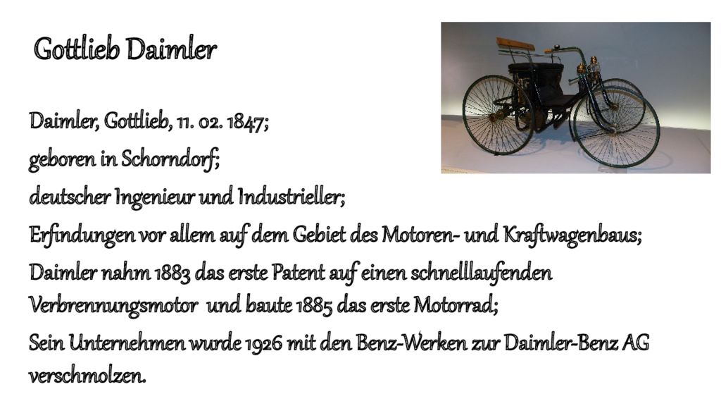 Daimler, Gottlieb, 11. 02. 1847; geboren in Schorndorf ; deutscher Ingenieur und Industrieller ; Erfindungen vor allem auf dem Gebiet des Motoren - und Kraftwagenbaus ; Daimler nahm 1883 das erste Patent auf einen schnelllaufenden Verbrennungsmotor und baute 1885 das erste Motorrad ; Sein Unternehmen wurde 1926 mit den Benz-Werken zur Daimler-Benz AG verschmolzen.