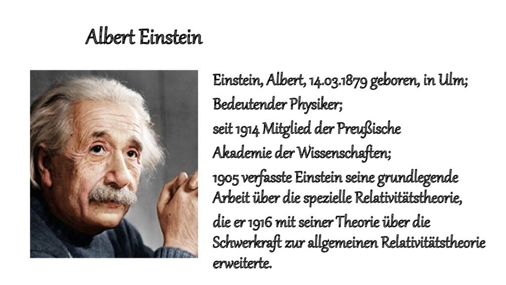 Einstein, Albert, 14.03.1879 geboren, in Ulm; Bedeutender Physiker; seit 1914 Mitglied der Preuß ische Akademie der Wissenschaften ; 1905 verfasste Einstein seine grundlegende Arbeit über die spezielle Relativitätstheorie, die er 1916 mit seiner Theorie über die Schwerkraft zur allgemeinen Relativitätstheorie erweiterte.