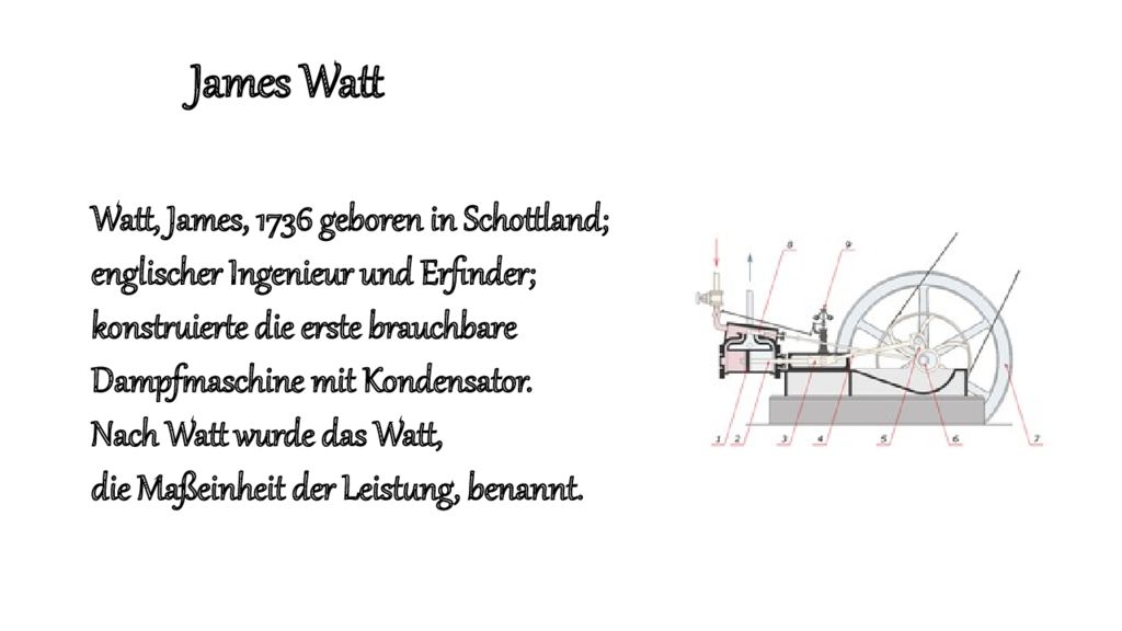 Watt, James, 1736 geboren in Schottland ; englischer Ingenieur und Erfinder ; konstruierte die erste brauchbare Dampfmaschine mit Kondensator. Nach Watt wurde das Watt, die Maßeinheit der Leistung, benannt.