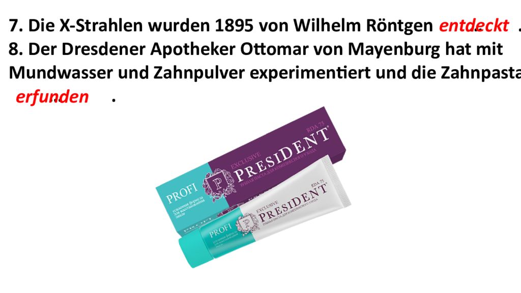 7. Die X-Strahlen wurden 1895 von Wilhelm Röntgen …. 8. Der Dresdener Apotheker Ottomar von Mayenburg hat mit Mundwasser und Zahnpulver experimentiert und die Zahnpasta …. entdeckt erfunden
