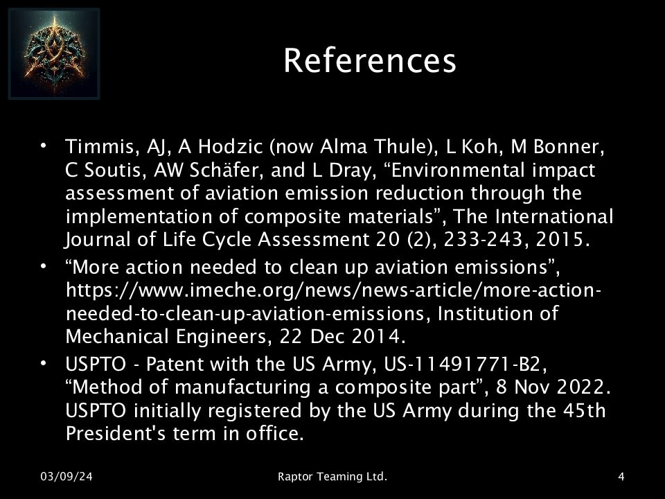 Timmis, AJ, A Hodzic (now Alma Thule), L Koh, M Bonner, C Soutis, AW Schäfer, and L Dray, “Environmental impact assessment of aviation emission reduction through the implementation of composite materials”, The International Journal of Life Cycle Assessment 20 (2), 233-243, 2015. “More action needed to clean up aviation emissions”, https ://www.imeche.org/news/news-article/more-action-needed-to-clean-up-aviation- emissions, Institution of Mechanical Engineers, 22 Dec 2014. USPTO - Patent with the US Army, US-11491771-B2, “Method of manufacturing a composite part”, 8 Nov 2022. USPTO initially registered by the US Army during the 45th President's term in office. 03/09/24 Raptor Teaming Ltd. 4