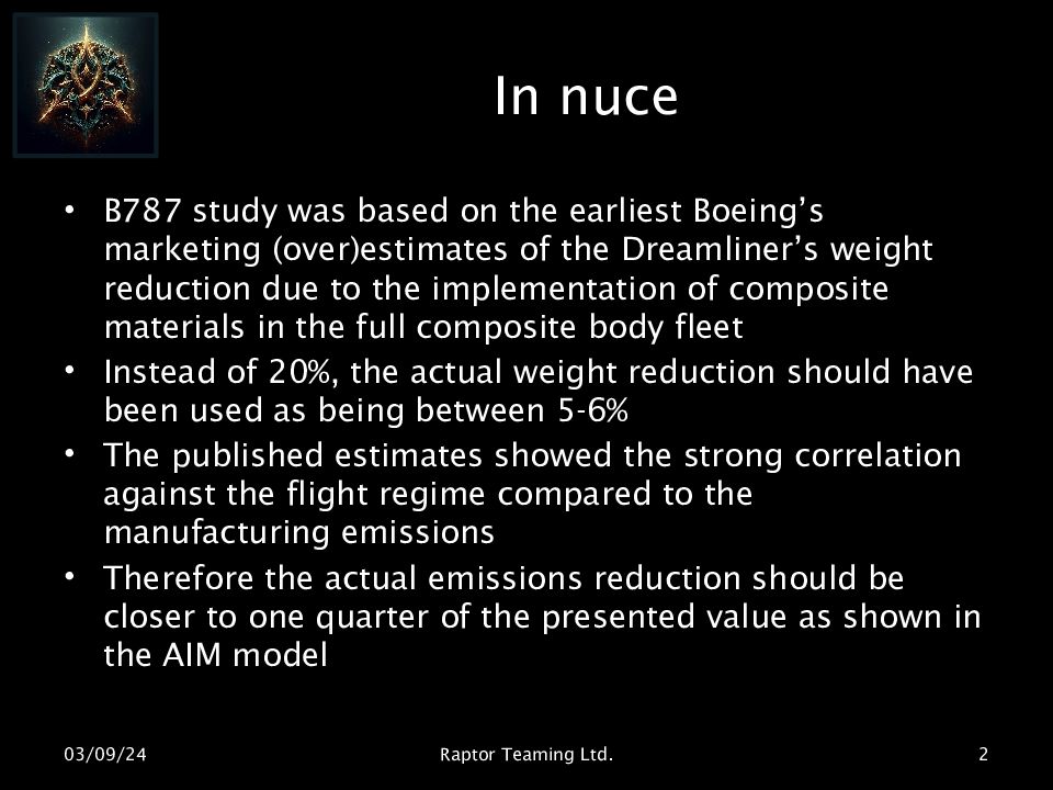 B787 study was based on the earliest Boeing’s marketing (over)estimates of the Dreamliner’s weight reduction due to the implementation of composite materials in the full composite body fleet Instead of 20%, the actual weight reduction should have been used as being between 5-6% The published estimates showed the strong correlation against the flight regime compared to the manufacturing emissions Therefore the actual emissions reduction should be closer to one quarter of the presented value as shown in the AIM model 03/09/24 Raptor Teaming Ltd. 2