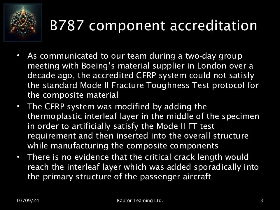 As communicated to our team during a two-day group meeting with Boeing’s material supplier in London over a decade ago, the accredited CFRP system could not satisfy the standard Mode II Fracture Toughness Test protocol for the composite material The CFRP system was modified by adding the thermoplastic interleaf layer in the middle of the specimen in order to artificially satisfy the Mode II FT test requirement and then inserted into the overall structure while manufacturing the composite components There is no evidence that the critical crack length would reach the interleaf layer which was added sporadically into the primary structure of the passenger aircraft 03/09/24 Raptor Teaming Ltd. 3