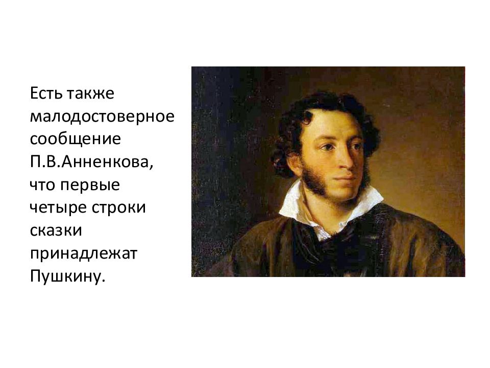 Есть также малодостоверное сообщение П.В.Анненкова, что первые четыре строки сказки принадлежат Пушкину.