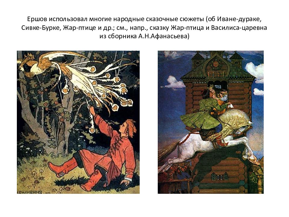 Слайд 6: Ершов использовал многие народные сказочные сюжеты (об Иване-дураке, Сивке-Бурке, Жар-птице и др.; см., напр., сказку Жар-птица и Василиса-царевна из сборника А.Н.Афанасьева)