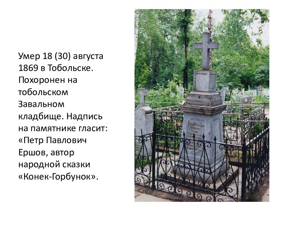Умер 18 (30) августа 1869 в Тобольске. Похоронен на тобольском Завальном кладбище. Надпись на памятнике гласит: «Петр Павлович Ершов, автор народной сказки «Конек-Горбунок».
