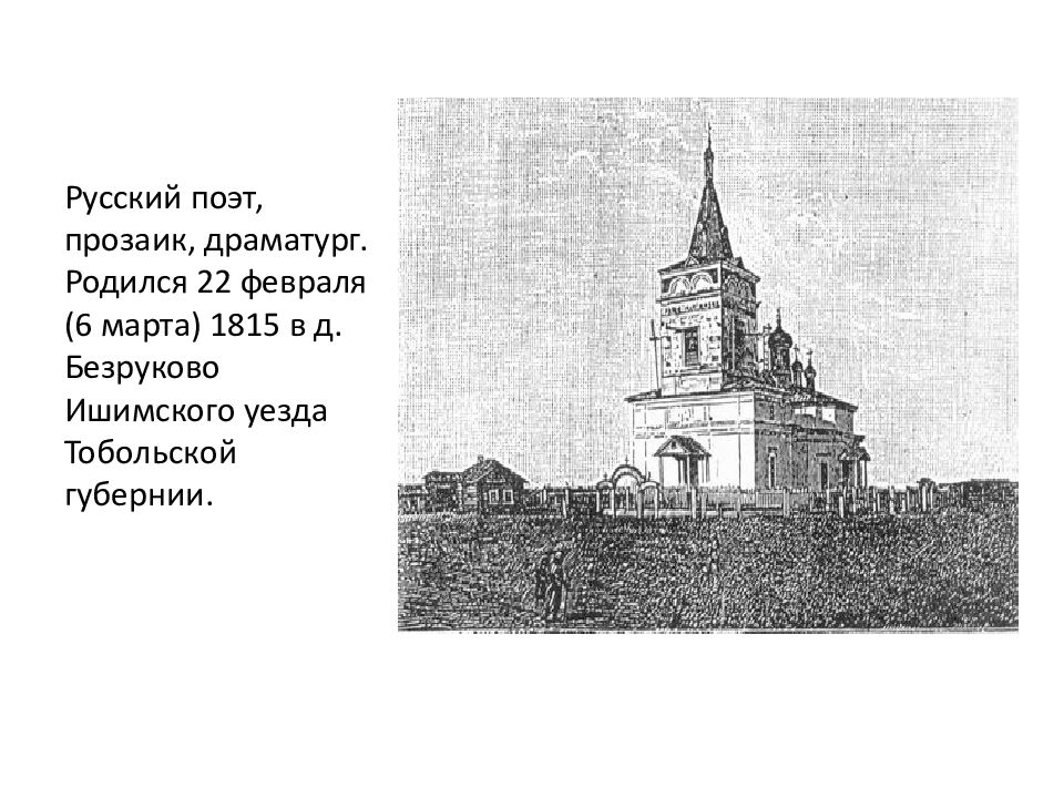 Русский поэт, прозаик, драматург. Родился 22 февраля (6 марта) 1815 в д. Безруково Ишимского уезда Тобольской губернии.