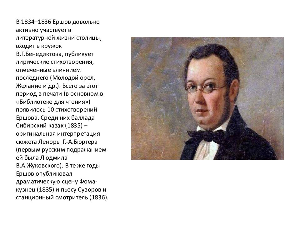 В 1834–1836 Ершов довольно активно участвует в литературной жизни столицы, входит в кружок В.Г.Бенедиктова, публикует лирические стихотворения, отмеченные влиянием последнего (Молодой орел, Желание и др.). Всего за этот период в печати (в основном в «Библиотеке для чтения») появилось 10 стихотворений Ершова. Среди них баллада Сибирский казак (1835) – оригинальная интерпретация сюжета Леноры Г.-А.Бюргера (первым русским подражанием ей была Людмила В.А.Жуковского). В те же годы Ершов опубликовал драматическую сцену Фома-кузнец (1835) и пьесу Суворов и станционный смотритель (1836).