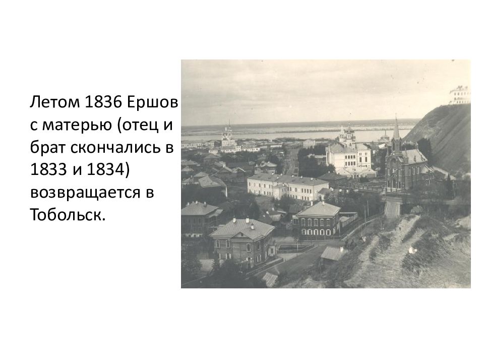 Летом 1836 Ершов с матерью (отец и брат скончались в 1833 и 1834) возвращается в Тобольск.
