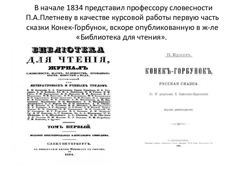 Слайд 5: В начале 1834 представил профессору словесности П.А.Плетневу в качестве курсовой работы первую часть сказки Конек-Горбунок, вскоре опубликованную в ж-ле «Библиотека для чтения»