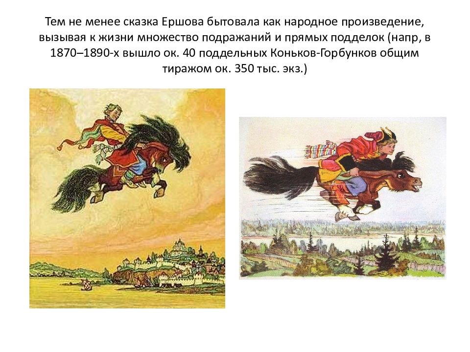 Слайд 8: Тем не менее сказка Ершова бытовала как народное произведение, вызывая к жизни множество подражаний и прямых подделок ( напр, в 1870–1890-х вышло ок. 40 поддельных Коньков-Горбунков общим тиражом ок. 350 тыс. экз.)