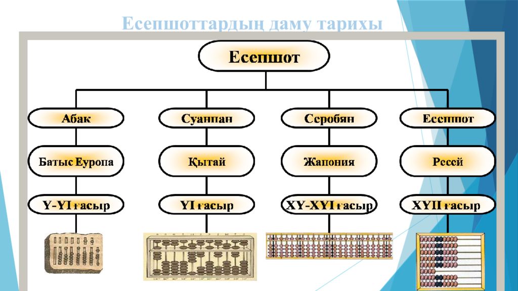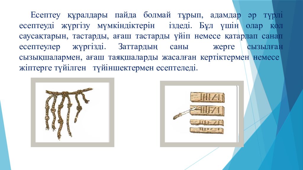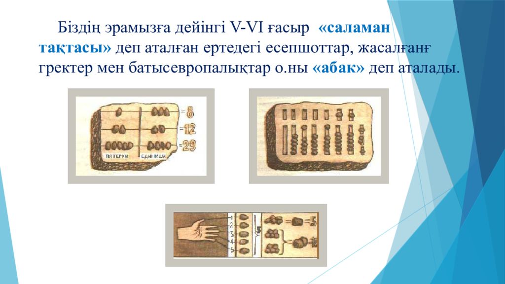 Есептеу құралдары пайда болмай тұрып, адамдар әр түрлі есептеуді жүргізу мүмкіндіктерін іздеді. Бұл үшін олар қол саусақтарын, тастарды, ағаш тастарды үйіп немесе қатарлап санап есептеулер жүргізді. Заттардың саны жерге сызылған сызықшалармен, ағаш таяқшаларды жасалған кертіктермен немесе жіптерге түйілген түйіншектермен есептеледі.