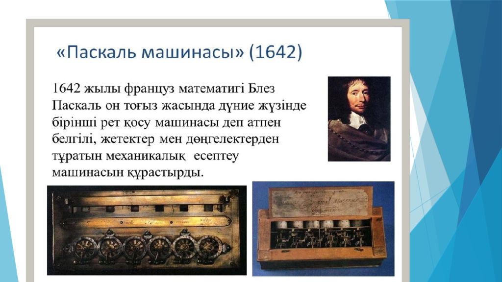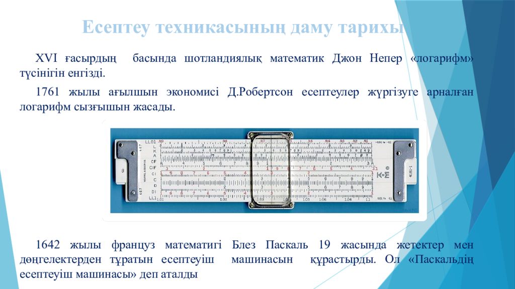 XVI ғасырдың басында шотландиялық математик Джон Непер «логарифм» түсінігін енгізді. 1761 жылы ағылшын экономисі Д.Робертсон есептеулер жүргізуге арналған логарифм сызғышын жасады. 1642 жылы француз математигі Блез Паскаль 19 жасында жетектер мен дөңгелектерден тұратын есептеуіш машинасын құрастырды. Ол «Паскальдің есептеуіш машинасы» деп аталды Есептеу техникасының даму тарихы