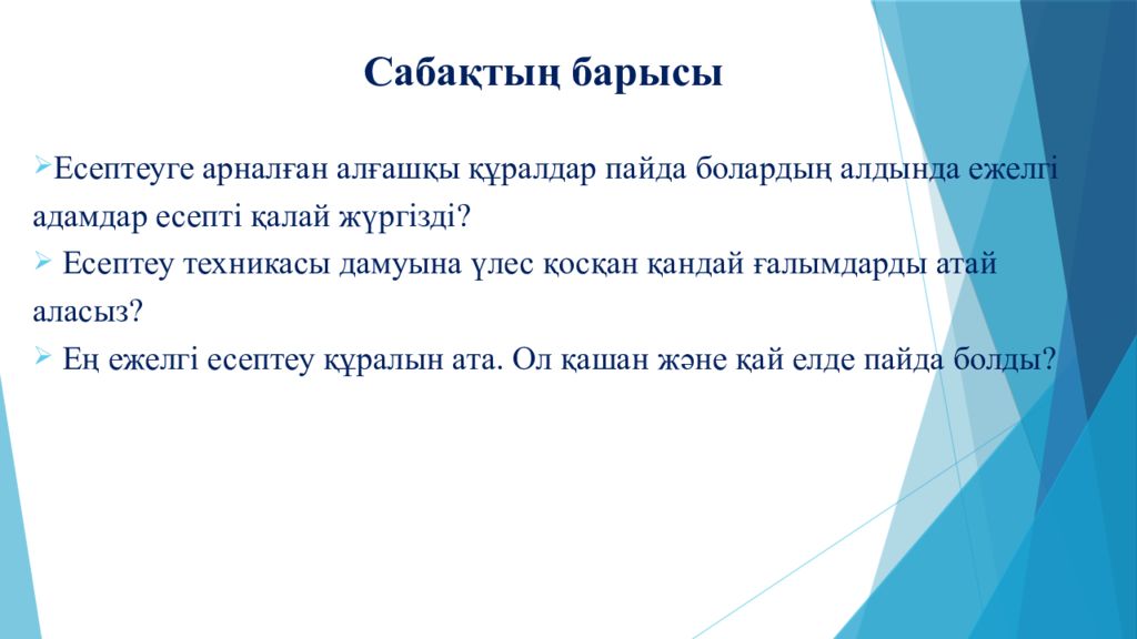 Есептеуге арналған алғашқы құралдар пайда болардың алдында ежелгі адамдар есепті қалай жүргізді ? Есептеу техникасы дамуына үлес қосқан қандай ғалымдарды атай аласыз ? Ең ежелгі есептеу құралын ата. Ол қашан және қай елде пайда болды ? Сабақтың барысы