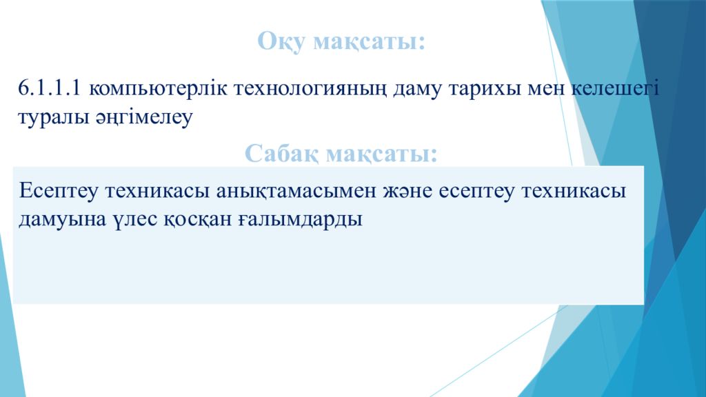 6.1.1.1 компьютерлік технологияның даму тарихы мен келешегі туралы әңгімелеу Сабақ мақсаты: Оқу мақсаты: Есептеу техникасы анықтамасымен және е септеу техникасы дамуына үлес қосқан ғалымдарды