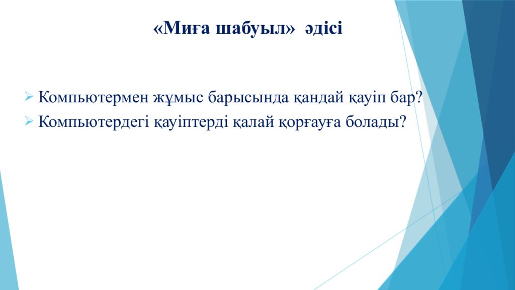 Компьютермен жұмыс барысында қандай қауіп ба р ? Компьютердегі қауіптерді қалай қорғауға болады? «Миға шабуыл» әдісі