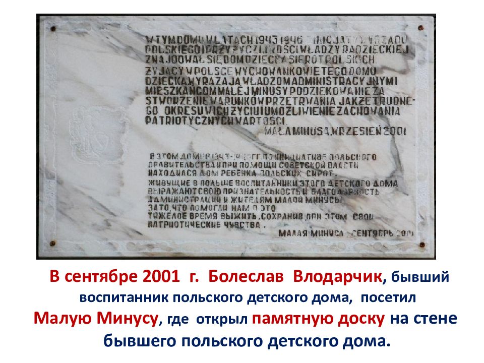 В сентябре 2001 г. Болеслав Влодарчик, бывший воспитанник польского детского дома, посетил Малую Минусу, где открыл памятную доску на стене бывшего польского детского дома.