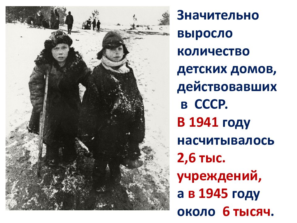 Значительно выросло количество детских домов, действовавших в СССР. В 1941 году насчитывалось 2,6 тыс. учреждений, а в 1945 году около 6 тысяч.