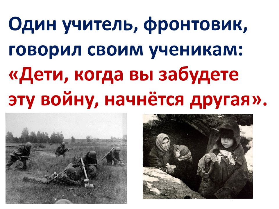 О дин учитель, фронтовик, говорил своим ученикам: «Дети, когда вы забудете эту войну, начнётся другая».